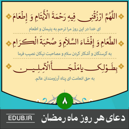 در دعای روز هشتم ماه مبارک رمضان آمده است: «خدایا در ماه رمضان مهرورزی نسبت به یتیمان را روزیام گردان چرا که رحم کردن به یتیم با خلوص نیت قلب را جلا میدهد. خدایا روزی کن که من اطعام طعام کنم و افطاری دهم، اطعام طعام مخصوصاً به فقرا