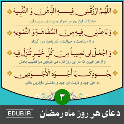 در دعای روز سوم ماه رمضان آمده است؛ «بار خدایا، ما را در این روز از خواب غفلت بیدار کن و در این روز مرا از کارهای باطل و سفیهانه دور گردان و خدایا هر کار خیری که در ماه رمضان نازل کردهای نصیبی از آن کار خیر به من برسان. »
