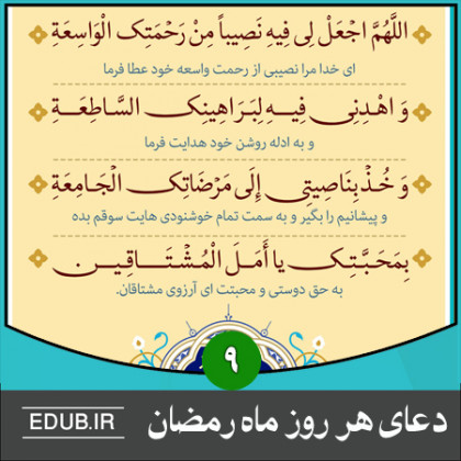 در دعای روز نهم ماه مبارک رمضان آمده است: «خدایا، من را از رحمت واسعه خودت نصیب گردان، من را به سمت موجبات خوشنودی و رضایت خودت ببر. از من راضی باش، هر چند که بد کردم و عمرم را به بطالت مصرف کردم. باید تمام عیبها را از خود دور کنم، و با غ