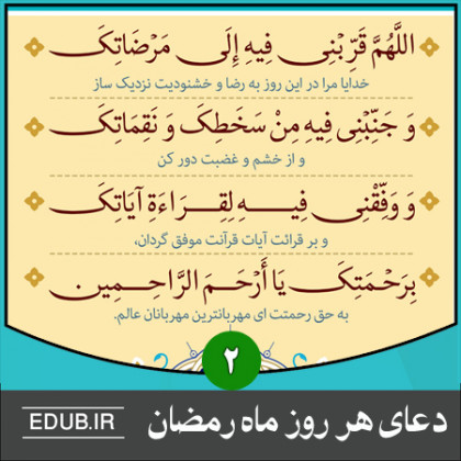 در دعای روز دوم ماه مبارک رمضان آمده است: «خدایا نزدیک کن مرا در این ماه به سوی خشنودیت و برکنارم دار در آن از خشم و انتقامت.»