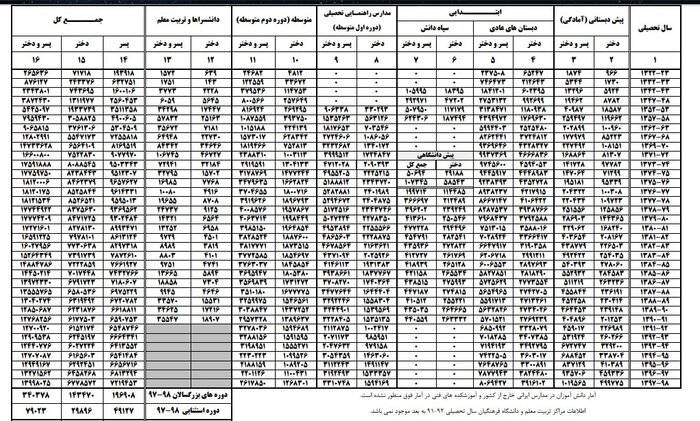 بر اساس این گزارش در سال تحصیلی۲۳-۱۳۲۲ جمعیت دانش آموزی ۲۶۵ هزار و ۶۳۶ و در سال تحصیلی۹۸-۱۳۹۷ جمعیت دانش آموزی۱۴میلیون و ۴۱۷هزار و ۴۲۶بوده است.