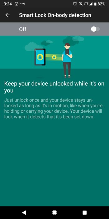 میتوانیم با مراجعه به قسمت (smart lock on-body detection) قفل هوشمند شخصی خود را انتخاب کنیم که وقتی رمز را وارد میکنیم تا زمانی که خودمان موبایل را قفل نکنیم دیگر موبایل قفل نشود. در این گزینه موبایل اندروید، نشانههایی فیزیکی مانند دست چپ یا راست بودن، صدا و صورت را شناسایی و ثبت میکند که اگر شما در اطراف موبایل خود نبودید، قفل شود.