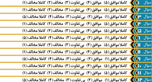 هرکدام از عبارتهای زیر را با دقت بخوانید و به هر سؤال باتوجه به گزینههای کاملا موافق/ موافق/ بیتفاوت/ مخالف/ کاملا مخالف پاسخ دهید.