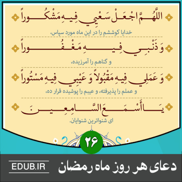 خدایا قرار بده کوشش مرا در این ماه قدردانـى شده وگناه مرا در این ماه آمرزیده وکردارم را در آن مورد قبول وعیب مرا در آن پوشیده اى شنواترین شنوایان.