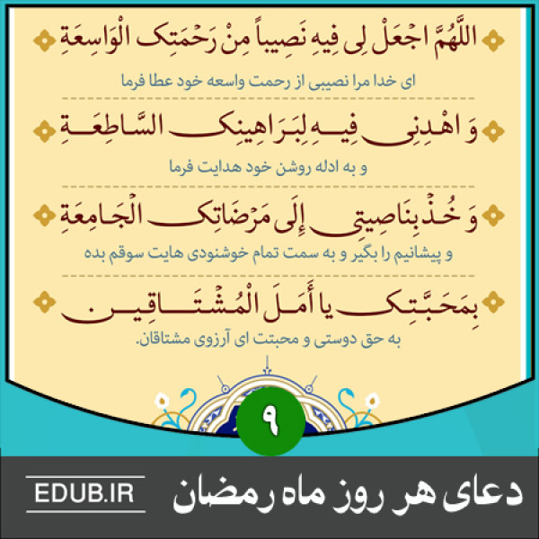 «خدایا قرار ده برایم در این روز بهرهای از رحمت وسیعت و راهنماییام کن در این ماه بهسوی دلیلهای درخشانت و مرا به سوی موجبات خوشنودی همه جانبهات سوق ده به حق محبتت ای آرزوی مشتاقان. »
