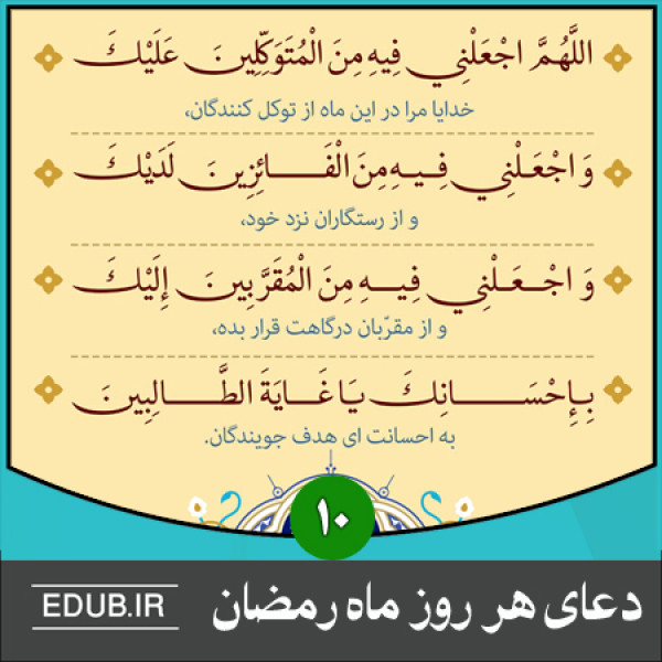 «خدایا قرارم ده در این ماه از توکلکنندگان بر خودت و بگردانم در آن از سعادتمندان درگاهت، قرارم ده در آن از مقربان پیشگاهت به حق احسانت ای هدف نهایی جویندگان.»