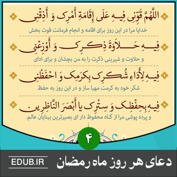 خدایا در روز چهارم ماه رمضان من را از گناه حفظ کن و توفیق ترک گناه بده تو ستارالعیوب هستی من را حفظم کن تا کسی از گناهان من با خبر نشود.