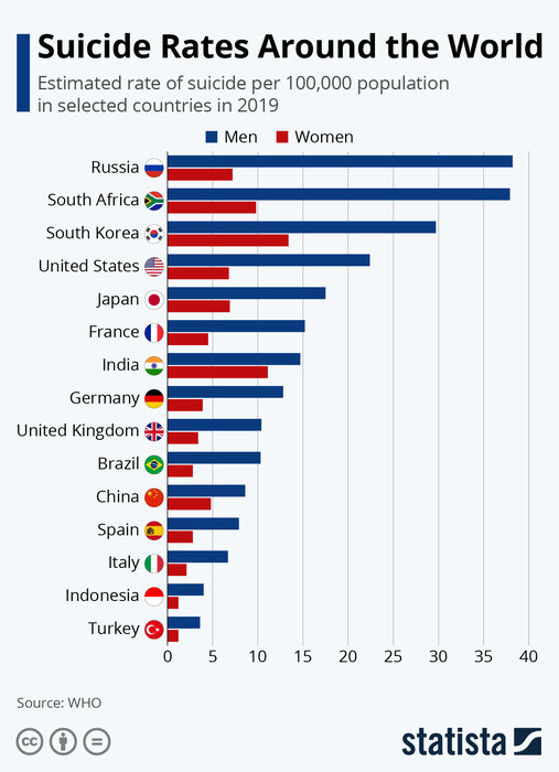 همانگونه که نمودار زیر نشان می دهد، نرخ خودکشی در جهان بسیار متفاوت است. این اینفوگرافیک با استفاده از تخمینهای سازمان بهداشت جهانی نشان می دهد، نرخ خودکشی برای مردان در بیشتر کشورها به طور قابل توجهی بالاتر است.