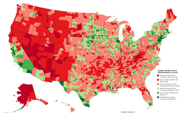 خودکشی در سال ۲۰۱۵، چهاردهمین علت مرگ زنان و هفتمین علت مرگ مردان در آمریکا بود. علاوه بر این، خودکشی دومین عامل مرگ و میر برای جوانان ۱۵ تا ۳۴ ساله و سومین علت مرگ برای افراد بین ۱۰ تا ۱۴ سال به شمار میرفت؛ روندی که در دیگر کشورهای مرفه رو به فزونی است.