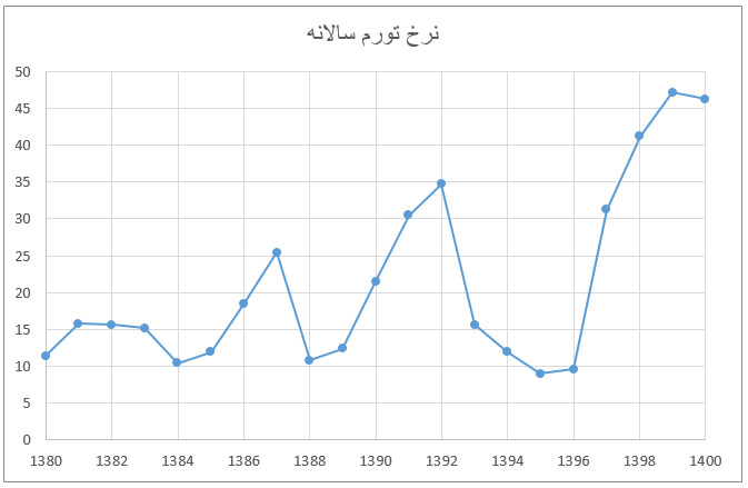 بنابراین، یکی از شاخصهایی که میتواند قدرت خرید ما را نشان دهد روند نرخ تورم است. در نمودار زیر این شاخص برای دو دهه، از ۱۳۸۰ تا ۱۴۰۰ نشان دادهشده است.