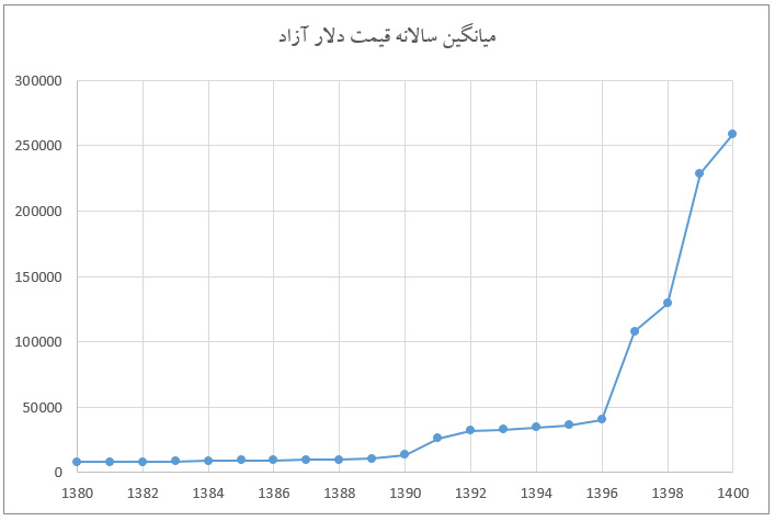 در نمودار زیر روند نرخ ارز در ۲۰ سال از ۱۳۸۰ تا ۱۴۰۰ نشان داده شده است. همانگونه که مشاهده میشود، در ۱۰ سال اول تا اندازهای روند نرخ دلار زیاد افزایشی نبوده اما از ۱۳۹۰ تا ۱۳۹۵ بیش از ۲ برابر شده است. بعد از آن نیز نیازی به گفتن ندارد که قیمت دلار در ۵ سال بیش از ۷ برابر شده است.