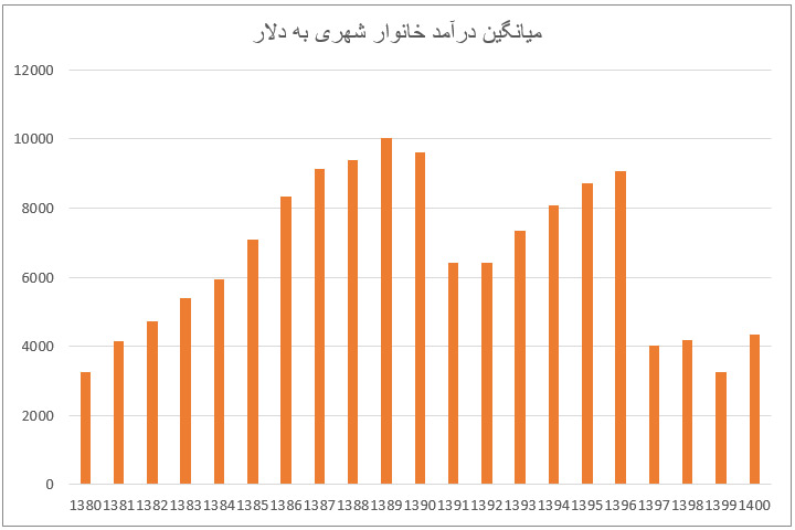 در نمودار زیر درآمد خانوار شهری ایران به دلار آمده است. در سالهای ۱۳۹۱ و ۱۳۹۷ میزان درآمد بهشدت افت کرده زیرا درآمد خانوار شهری به نسبت افزایش دلار، بالا نرفته است.