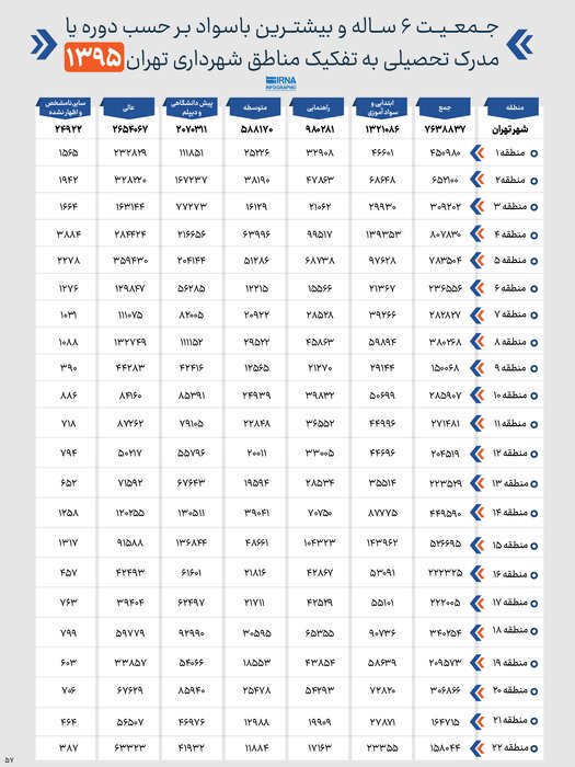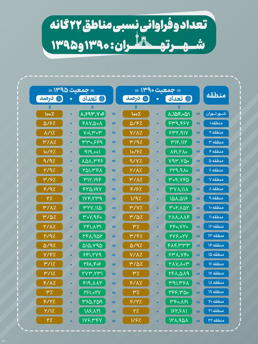 جدول ترکیب جمعیتی مناطق ۲۲ گانه تهران و نمودارهای آن بر اساس آخرین آمار ثبت شده در مرکز آمار ایران در جداول ذیل ارائه شده است: