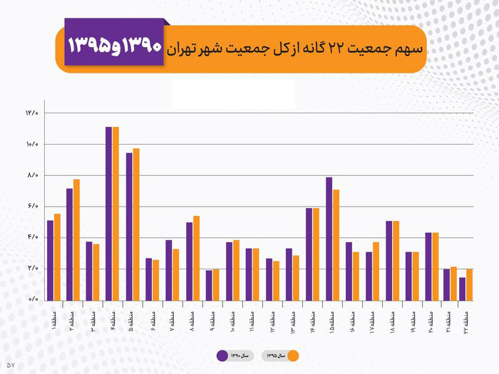 دادههای مرکز آمار ایران در سال ۱۳۹۵ نشان میدهد، جمعیت ساکن شهر تهران حدود ۸ میلیون و ۷۰۰ هزار نفر است. بیشترین میزان جمعیت در منطقه چهار این شهر با حدود ۹۲۰ هزار نفر ساکن است که حدود ۱۰.۶ درصد جمعیت پایتخت است. بعد از آن به ترتیب منطقه ۵ با ۹.۱ درصد و منطقه ۲ با ۸.۱ درصد در ردههای دوم و سوم هستند. کمترین میزان جمعیت نیز در مناطق ۹ و ۲۲ با حدود دو درصد در سال ۱۳۹۵ ثبت شده است. البته جمعیت منطقه ۲۲ تهران به سرعت در حال افزایش است.