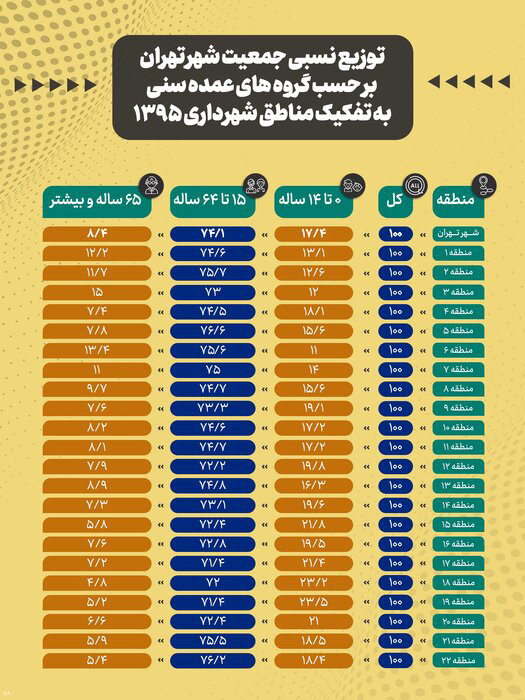 در جدول زیر ترکیب سنی جمعیت تهران دیده میشود. دادههای این جدول نشان میدهد مناطق ۱۹ و ۱۸ و ۲۰ جوانترین مناطق و مناطق ۳ و ۶ و ۱ سالمندترین مناطق تهران هستند. مرکز آمار ایران همچنین ترکیب سواد ساکنان مناطق ۲۲ گانه تهران را در سال ۹۵ در این جدول اعلام کرده است:
