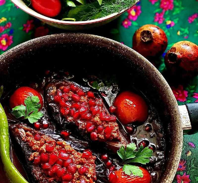 برای تهیه این خوراک، بادمجان را بهشکل درسته سرخ میکنند و سپس، میان آن را برش میزنند. برای مواد میانی، کمی پیازداغ، گردو، دانه انار، رب انار و آلوچه جنگلی را با هم تفت میدهند و در صورت تمایل، کمی پونه خشک یا سبزی معطر موجود را به آن اضافه میکنند. مواد را داخل شکم بادمجان ریخته و با سس محتوی رب انار روی آن را پوشانده و مجددا روی حرارت میگذارند تا پخت کامل شود و به اصطلاح، مزهها به خورد هم برود. برخی به مواد داخل بادمجان، مقداری گوشت چرخکرده و رب گوجهفرنگی نیز اضافه میکنند.
