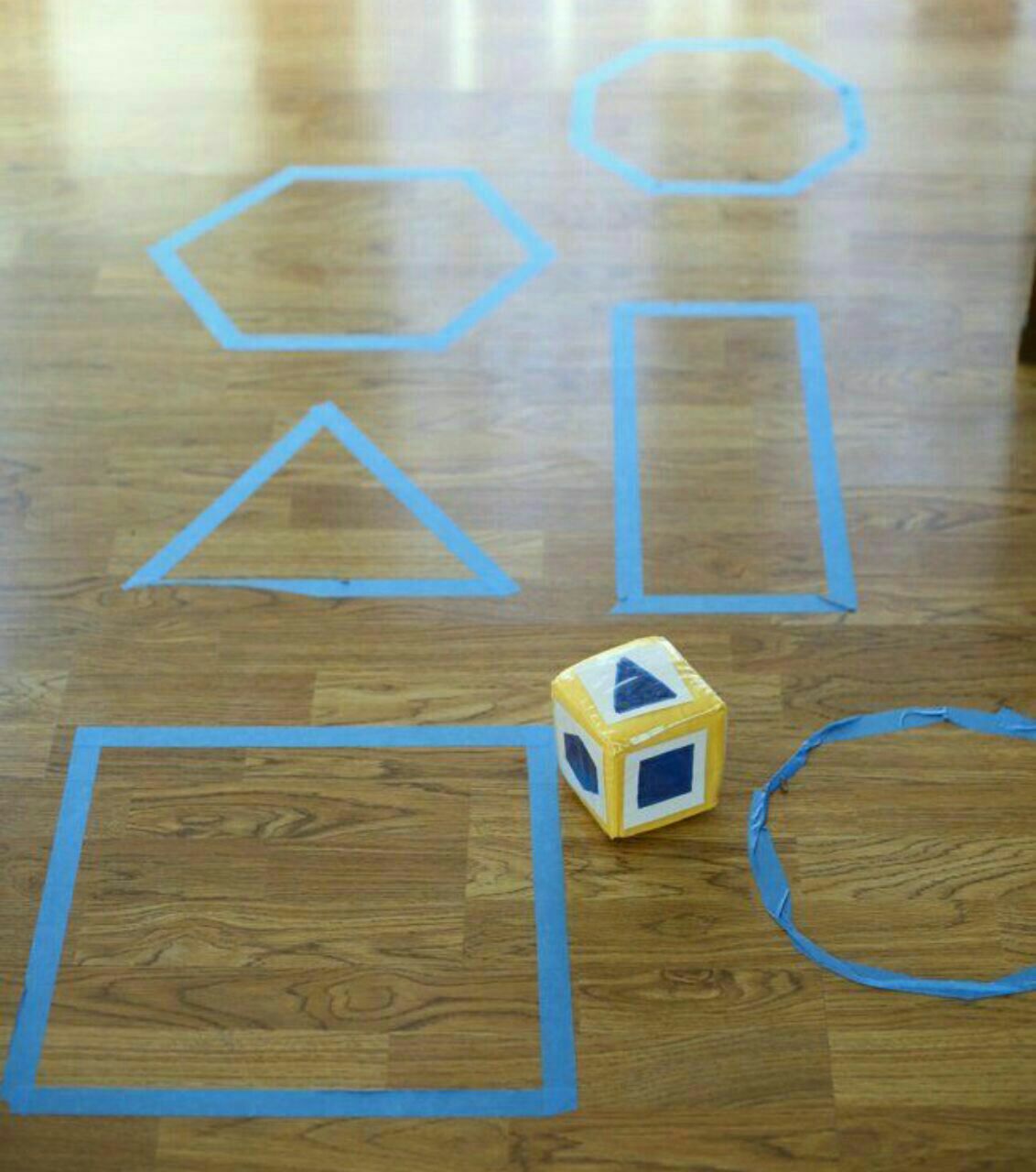 روش کار: با کمک نوار چسب های رنگی یا مقوا یا نخ کاموا اشکالی را روی سطح زمین درست کنید. روی یک تاس مقوایی شش شکل هندسی مانند دایره، مستطیل و مثلث و ... بکشید. تاس را بیندازید کودک باید با دیدن شکل، اسم آن را بلند بگوید و روی همان شکل بپرد.