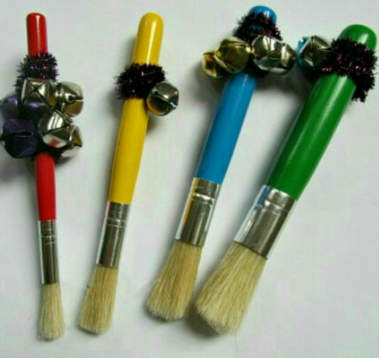 روش کار: چند قلم موی بزرگ و با رنگ های مختلف تهیه کنید و یا خودتان رنگ بزنید. به سر هر قلم مو به ترتیب یک، دو، سه و... زنگوله وصل کنید. از کودک بخواهید تا با قلم ها نقاشی بکشد. و به صدای تولید شده ی هر کدام توجه کند.