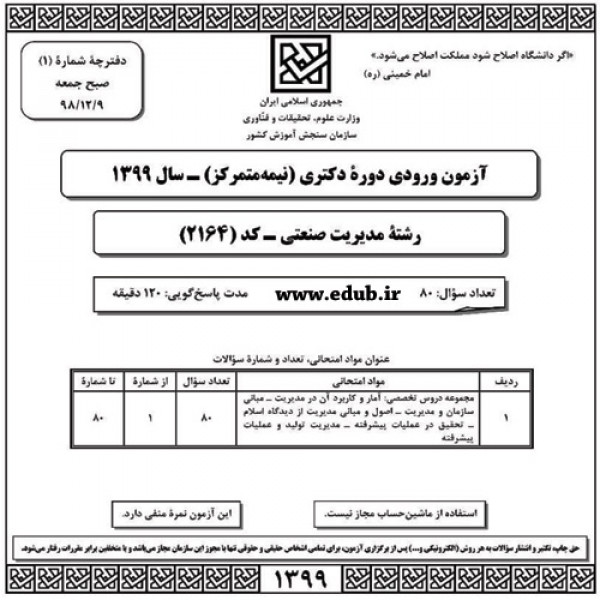 سئوالات و پاسخنامه آزمون دکترای سال 99 رشته مدیریت صنعتی