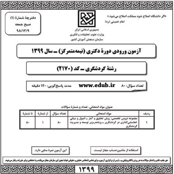 سئوالات و پاسخنامه آزمون دکترای سال 99رشته گردشگری