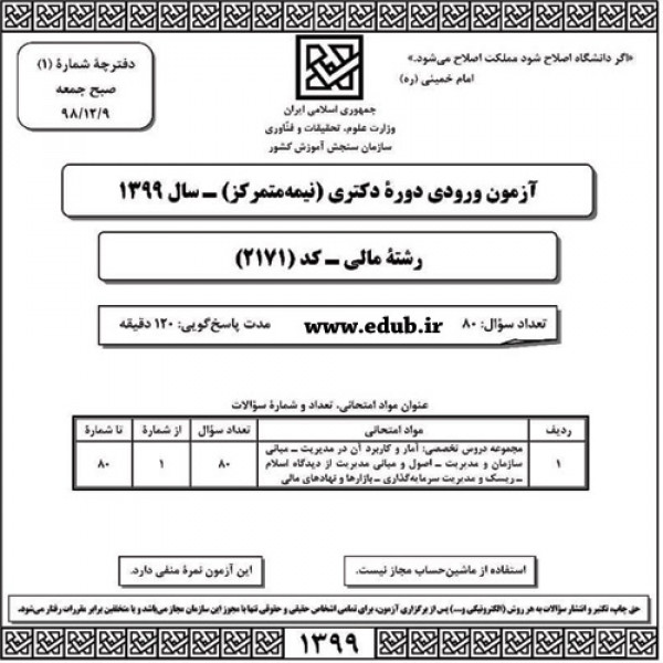 سئوالات و پاسخنامه آزمون دکترای سال 99 رشته مالی