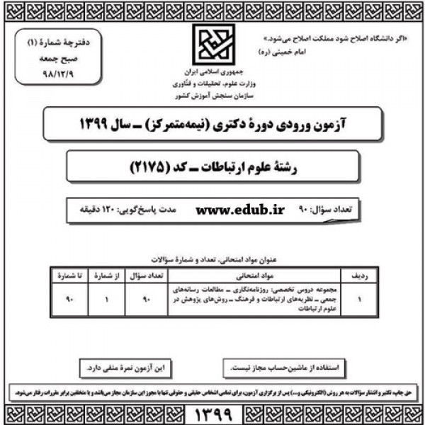 سئوالات و پاسخنامه آزمون دکترای سال 99رشته علوم ارتباطات