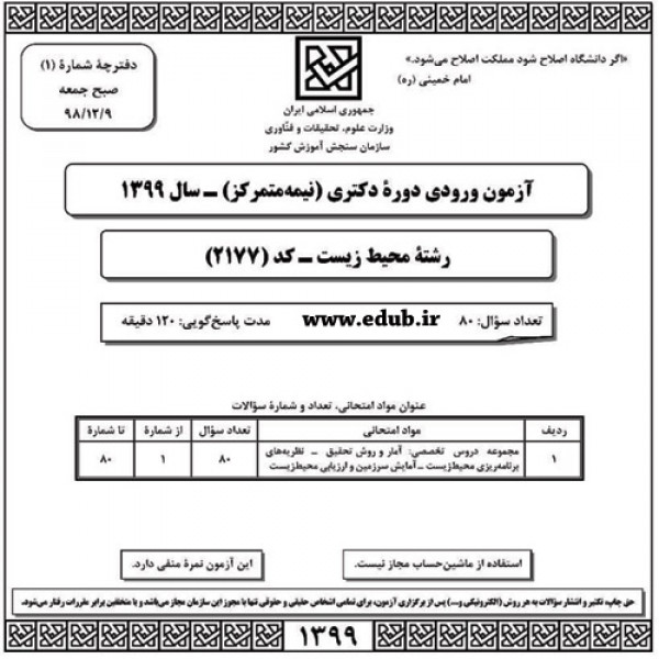سئوالات و پاسخنامه آزمون دکترای سال 99رشته محیط زیست