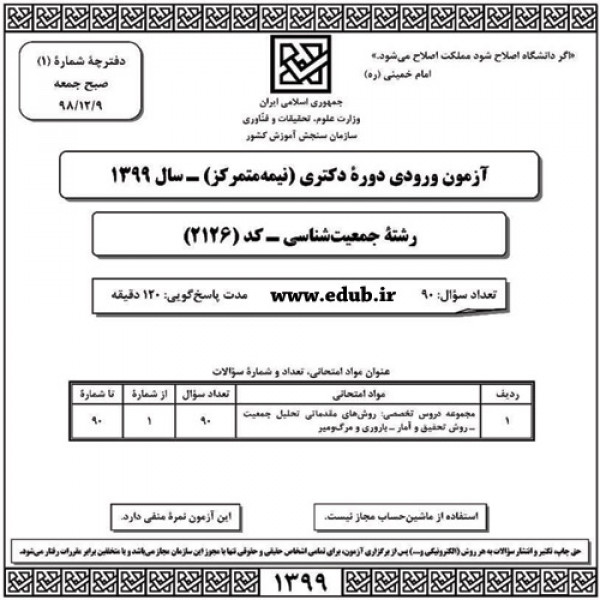 سئوالات و پاسخنامه آزمون دکترای سال 99 رشته جمعیت شناسی