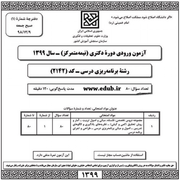 سئوالات و پاسخنامه آزمون دکترای سال 99 رشته برنامه ریزی درسی