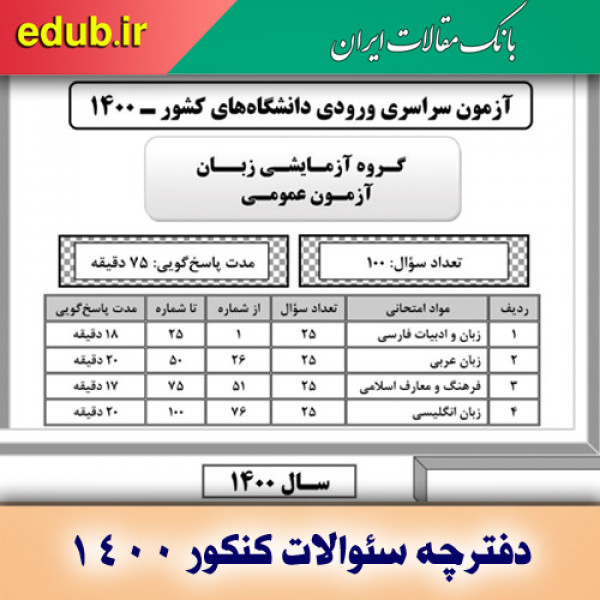 سئوالات دفترچه عمومی کنکور سراسری سال 1400 گروه آزمایشی زبان دارای 100 سئوال بوده است که داوطلبان می بایست در مدت 75 دقیقه به این سئوالات پاسخ دهند .