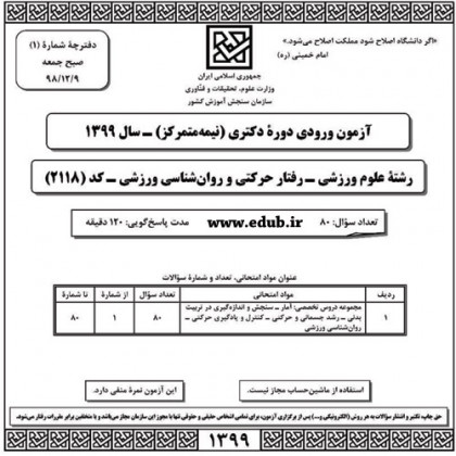 سئوالات و پاسخنامه آزمون دکترای سال 99 رشته رفتار حرکتی و روانشناسی ورزشی