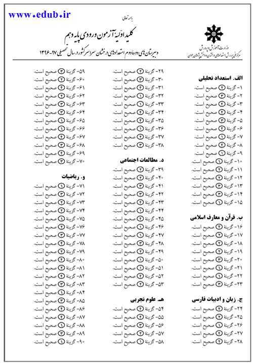 پاسخنامه و کلید سئوالات آزمون تیزهوشان پایه دهم استعدادهای درخشان سال تحصیلی 97 – 96