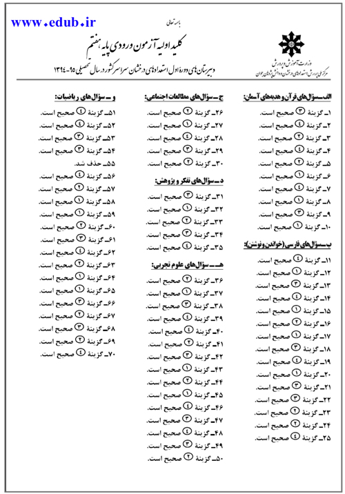 پاسخنامه و کلید سئوالات آزمون تیزهوشان پایه هفتم استعدادهای درخشان سال تحصیلی 95 – 94