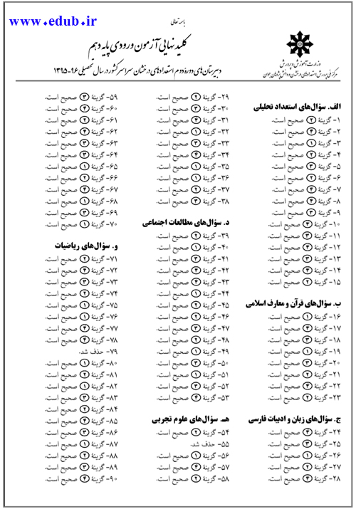 پاسخنامه و کلید سئوالات آزمون تیزهوشان پایه دهم استعدادهای درخشان سال تحصیلی 96 – 95
